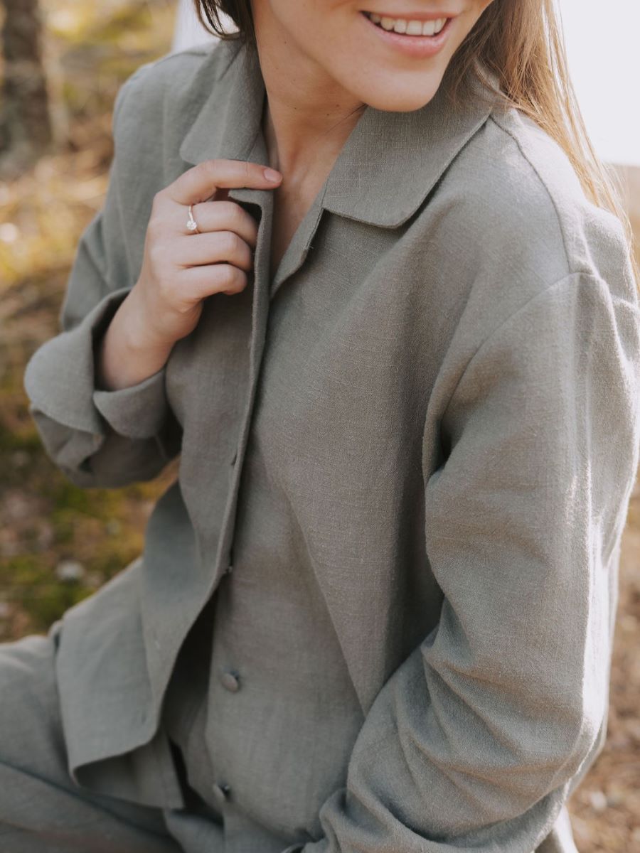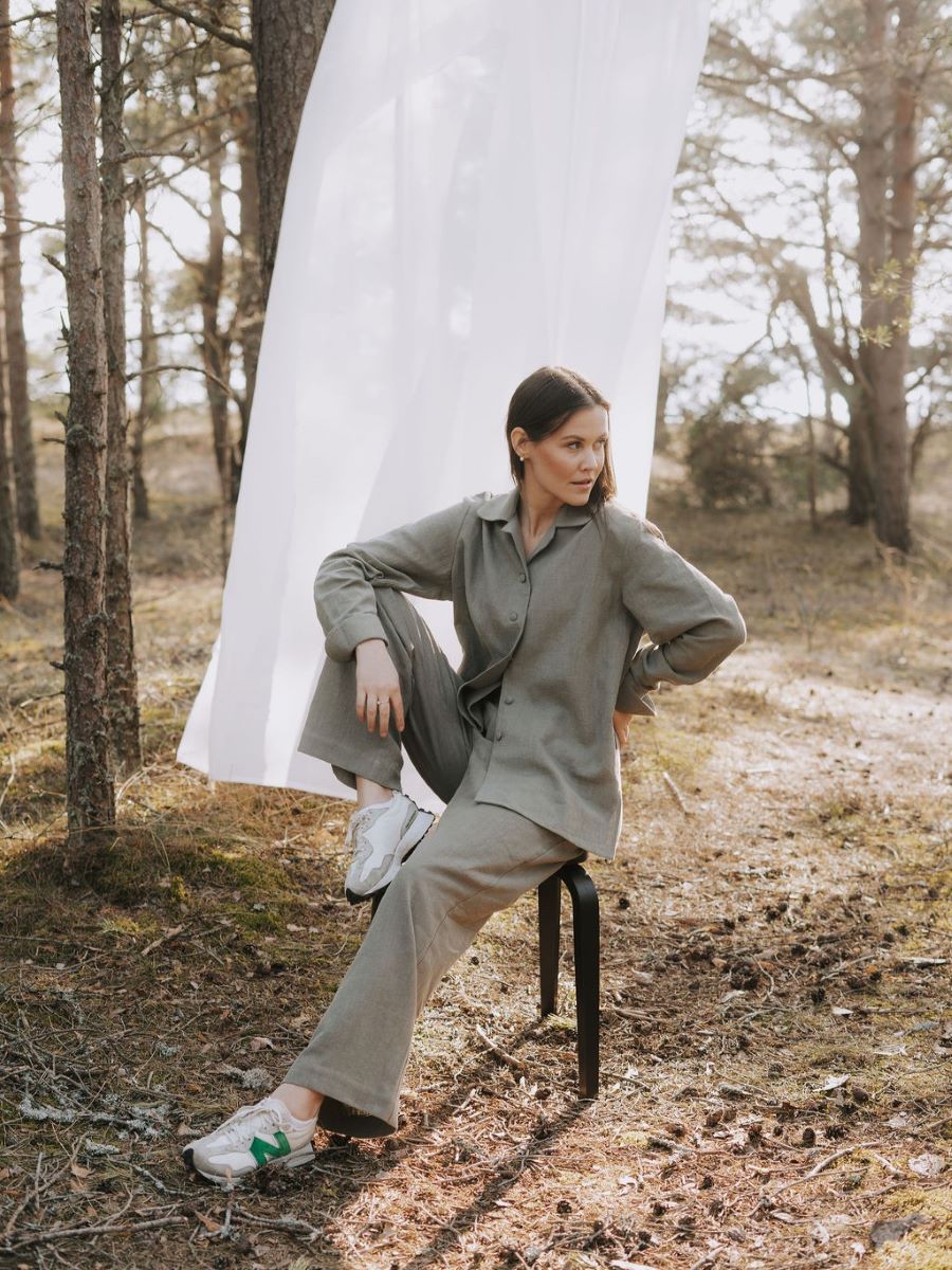 Avasta meie kollektsiooni linane triiksärk, mis ühendab endas looduse tarkuse ja ajatu disaini. Haruu linasest pluusil on kergelt over-sized lõige ja varrukad, mida saab nii üles keerata, kui ka kanda pikemalt, vastavalt eelistusele. Erilist tähelepanu köidavad hoolikalt läbimõeldud varrukadetailid, mis annavad klassikalisele lõikele kaasaegse puudutuse.Linasest pluusi on lihtne kanda peaaegu nagu jakina, sest kangaga kaetud nööbid võimaldavad seda. Sobib kanda igapäevaselt kui ka pidulikematel üritustel. Pluusiga samasse komplekti kuuluvad ka linased püksid.