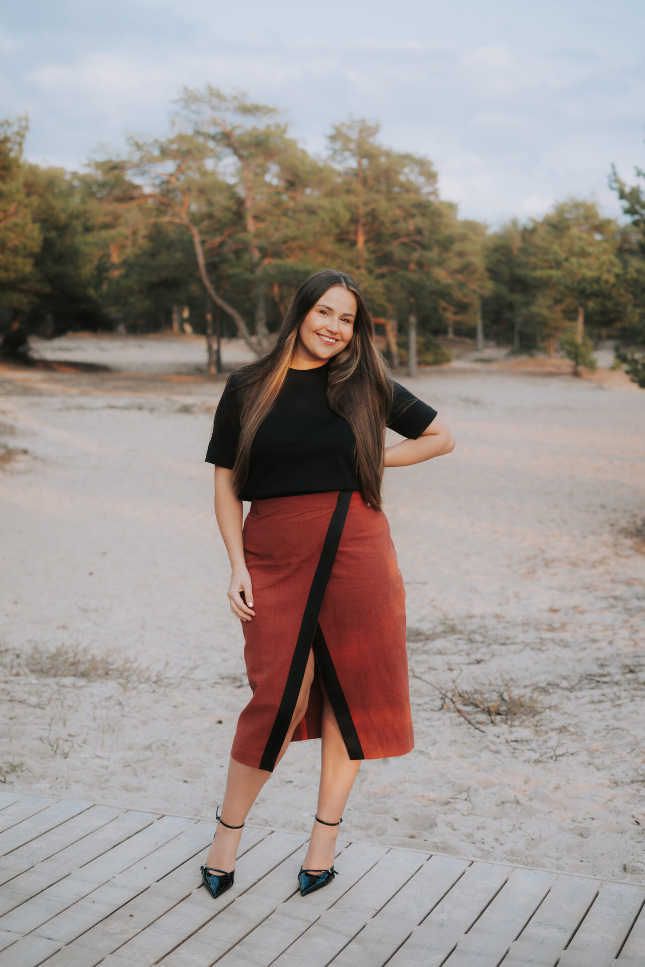 Haruu New York Fashion Week raames valminud uus linasest seelik viskoosist äärisega on tõeline pärl sinu garderoobis! See käsitööna Eestis valmistatud seelik ühendab endas linase kanga naturaalse ilu ning viskoosist äärise luksusliku pehmuse, luues rõivaeseme, mis väljendab rafineeritud maitsemeelt ja ajatut stiili.
